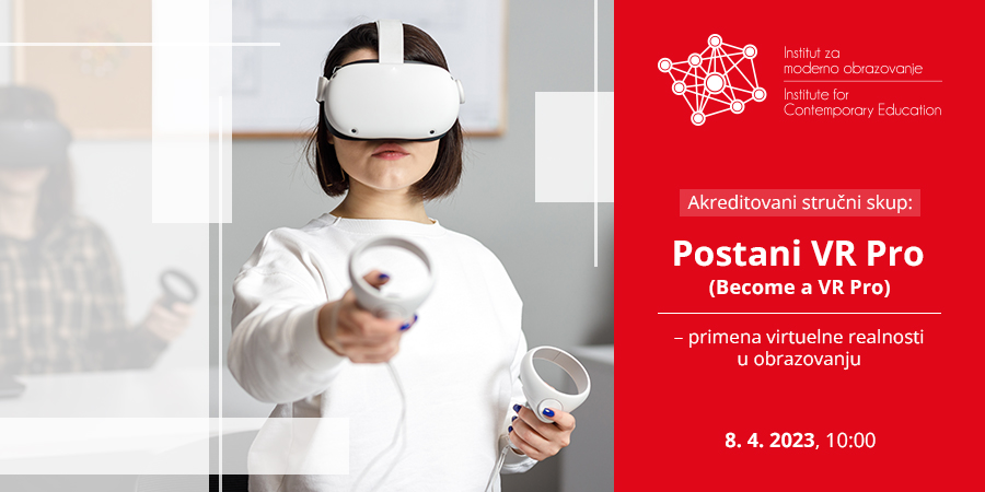 Centar za stručno usavršavanje Instituta za moderno obrazovanje poziva vas na stručni skup – savetovanje pod nazivom „Postani VR Pro (Become a VR Pro) – primena virtuelne realnosti u obrazovanju” u subotu, 8. aprila, u prostorijama Instituta za moderno obrazovanje (Beograđanka, Masarikova 5, III sprat, ulaz iz Kralja Milana), od 10:00 do 16:00.