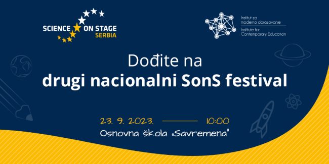 Dođite na drugi nacionalni SonS festival   Institut za moderno obrazovanje vas poziva na drugi nacionalni SonS festival, koji će se održati u subotu, 23. septembra, s početkom u 10 časova, u Osnovnoj školi „Savremena” (Omladinskih brigada 86).  Festival je za javnost otvoren od 14:00. Ovaj festival je prilika da zajedno proslavimo i promovišemo nauku,…