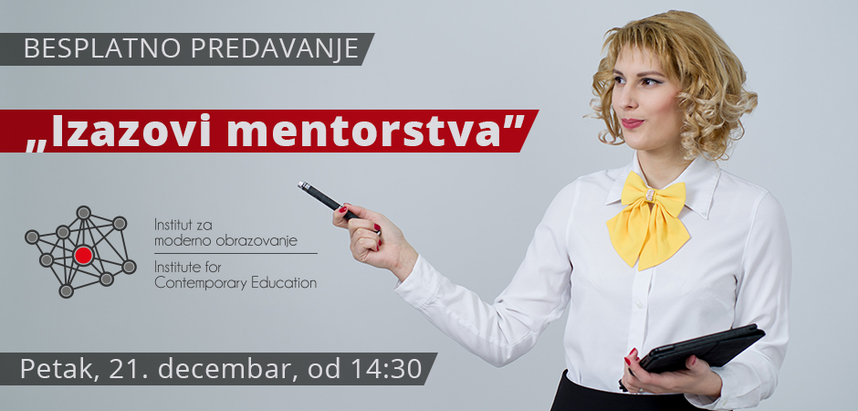 Centar za stručno usavršavanje Instituta za moderno obrazovanje organizuje novo besplatno predavanje u okviru ciklusa „Nauči, diskutuj, primeni”. Ovo predavanje na temu „Izazovi mentorstva” održaće se u petak, 21. decembra 2018, od 14:30 do 16:00 u prostorijama Instituta (Beograđanka, Masarikova 5, ulaz iz Kralja Milana, III sprat, učionica broj 10).