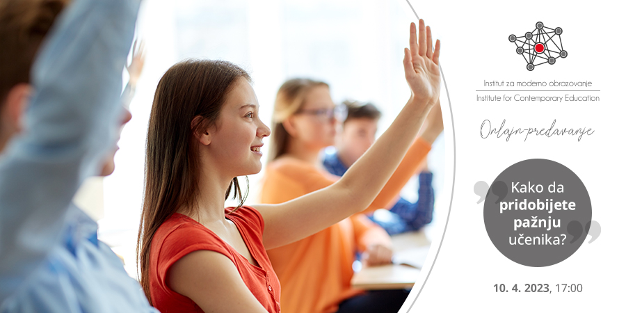 Institut za moderno obrazovanje, u organizaciji Centra za stručno usavršavanje, organizuje onlajn-predavanje „Kako da pridobijete pažnju učenika?”. Predavanje će se održati u ponedeljak, 10. 4. 2023, s početkom u 17:00, na DL platformi Instituta za moderno obrazovanje.