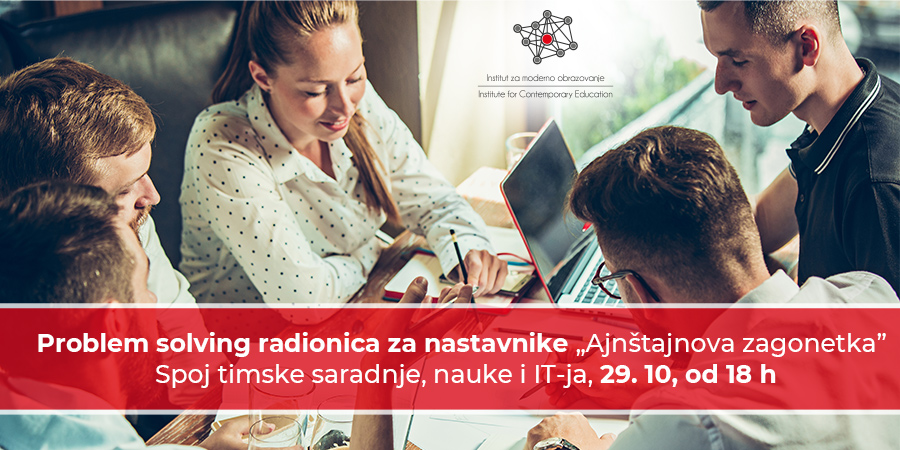 Institut za moderno obrazovanje poziva sve zaposlene u obrazovanju da se pridruže novoj problem solving radionici pod nazivom „Ajnštajnova zagonetka”, koja će vam pokazati na koji način se kroz kreativno rešavanje problema integrišu sve STEAM oblasti i na smislen način povezuju socioemocionalne, akademske i digitalne kompetencije učenika. Radionica će se održati u četvrtak, 29. 10, od 18 h, u prostorijama Instituta za moderno obrazovanje ili putem pristupnih podataka koje ćete blagovremeno dobiti.